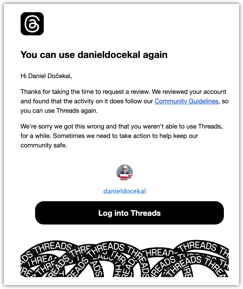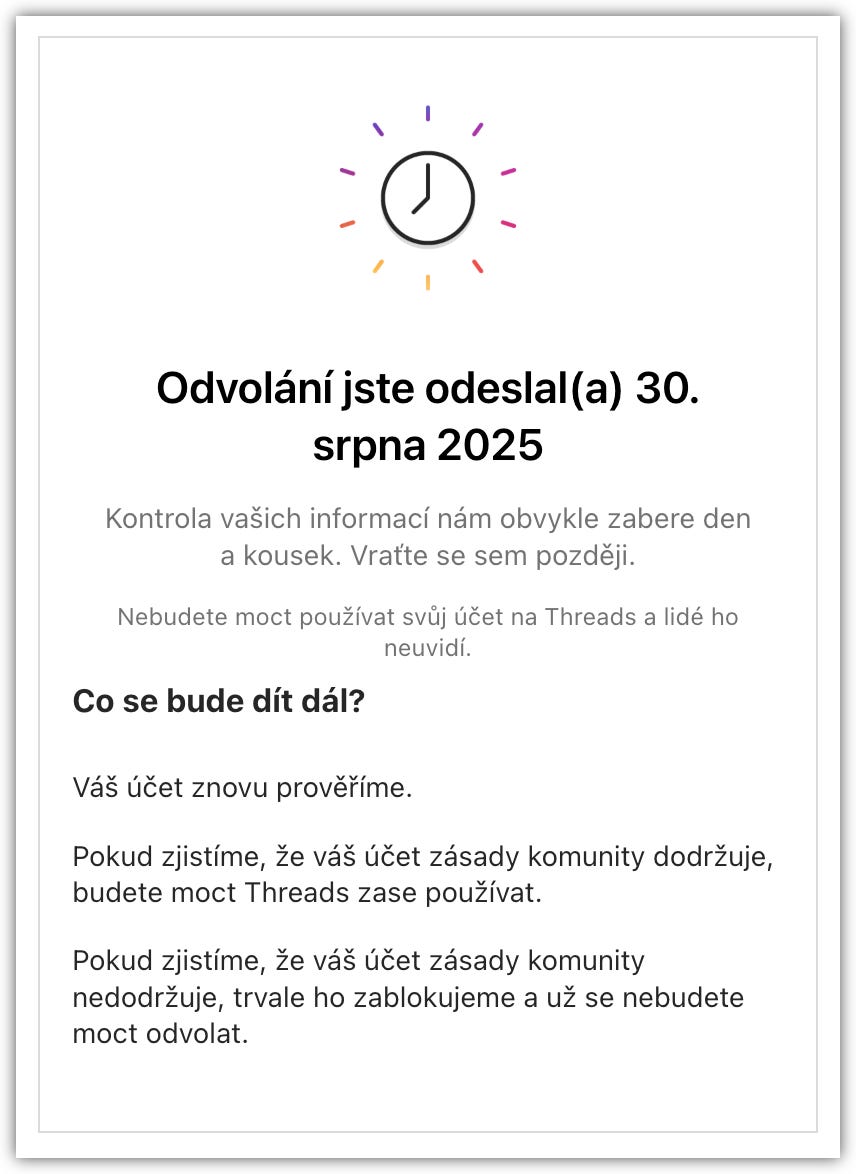 🤦 Tak už mám zase zpět osobní Threads. 30. srpna to náhle skončilo zablokováním a dva dny trvalo, než to odblokovali. Neřekli ani fň proč blokovali. Celé ty dva dny mi to nechybělo ani trochu.