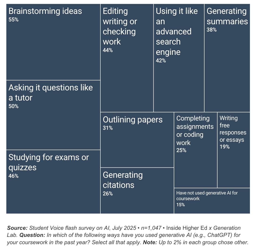 Průzkum Student Voice, který se zaměřil na názory studentů na generativní umělou inteligenci ve vzdělávání: 85 % z 1 047 dotázaných studentů uvedlo, že AI využívají při studiu, přičemž většina preferuje proaktivní přístup k řešení otázek akademické integrity. (Inside Higher Ed)