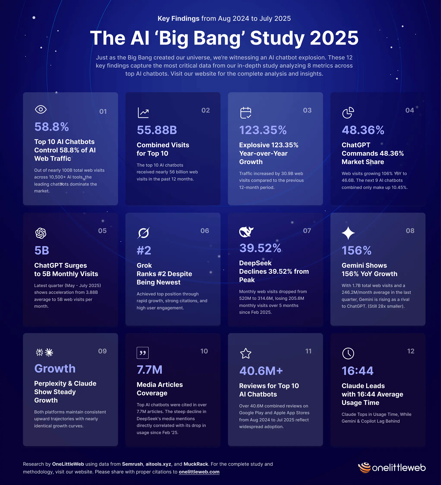 Studie AI 'Velký třesk' 2025: Nejlepší AI chatboti a co odhaluje 55,88 miliardy návštěv (OneLittleWeb)