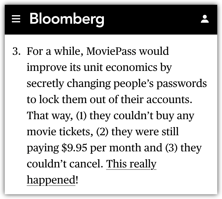 Připadá vám níže uvedené jako nemožné? Výmysl? Bohužel ne. Taková byla obchodní taktika MoviPass (Bloomberg)