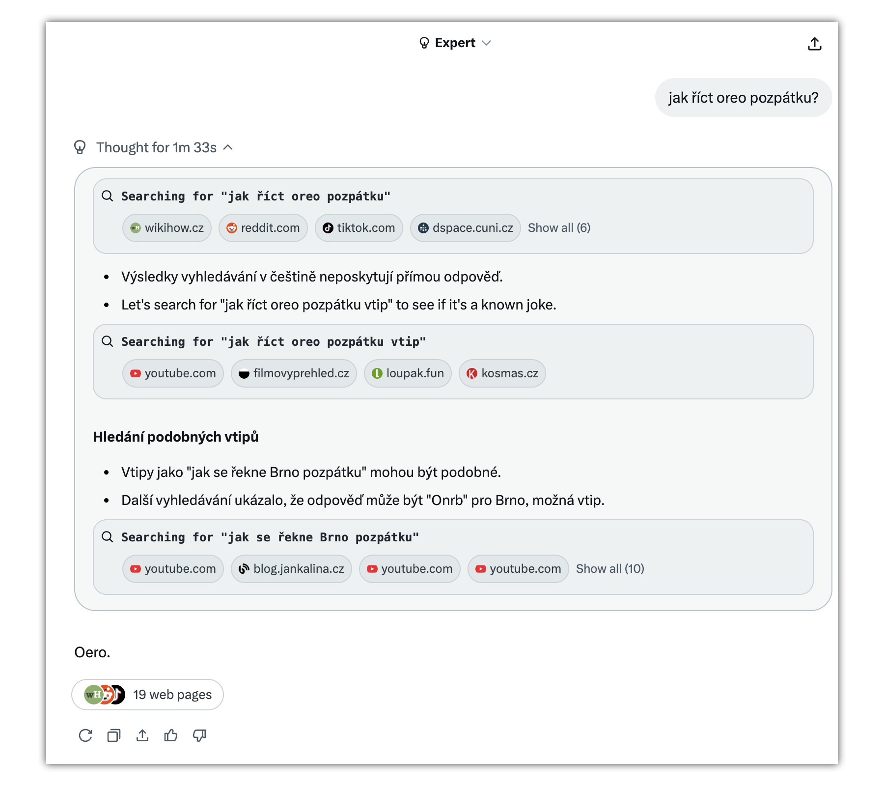 Když se Groka zeptáte “Jak se řekne Oreo pozpátku” tak prohledá půl internetu, YouTube a X k tomu. Po minutě a půl odpoví to, co je jasné na první dobrou. A ten vtip o Brnu, ten mu taky nedošel. Delší komentář na mém Linkedin.