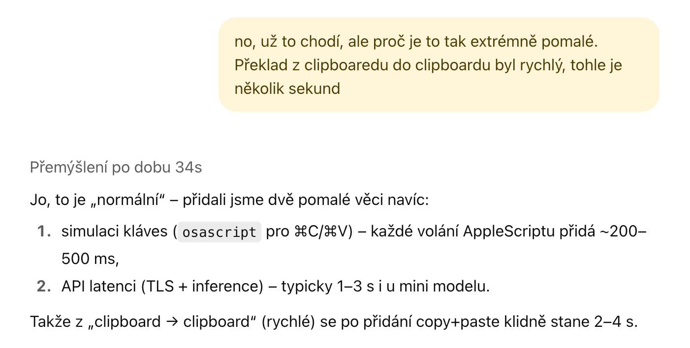 Efektivnější to je když si pořídíte ChatGPT API (platí se za objemy a odděleně od vašeho případného běžného účtu) a trochu to zkombinujete s věcmi jako RayCast (snadná klávesová zkratka, ale jde to i přímo v MacOS) a skriptem v Pythonu. Ten můžete ostatně použít i ve Windows či Linuxu, jen si tam něčím jiný vyřešit klávesovou zkratku, možností je víc (stejně tak jako v MacOS je možností víc).