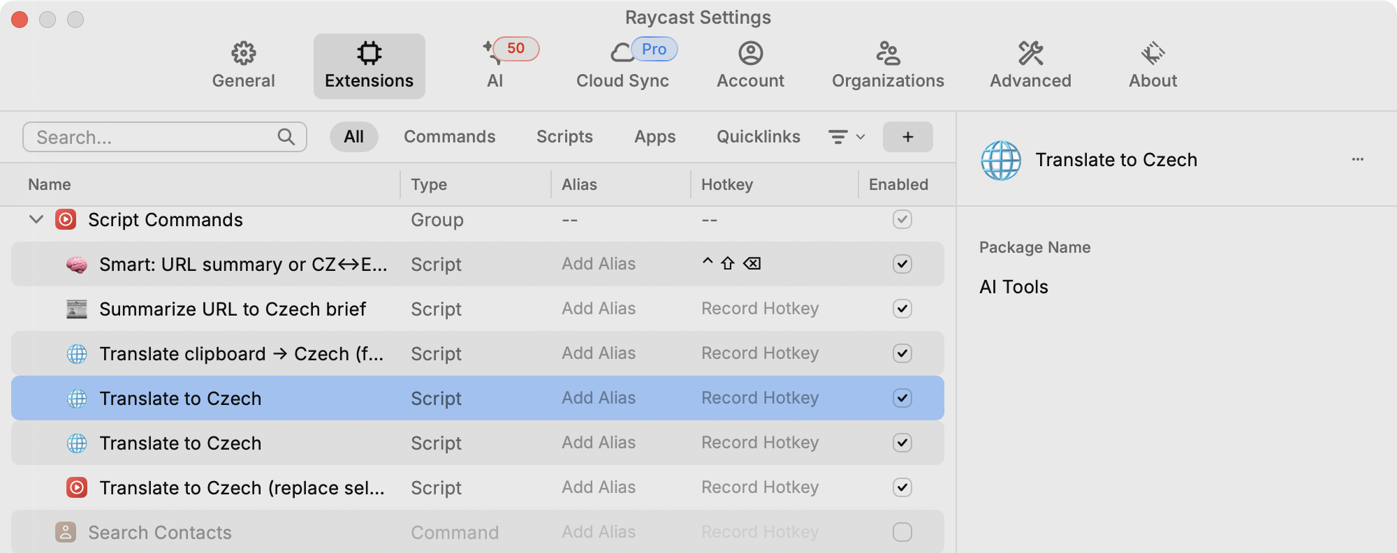 Výhoda řešení přes schránku je, že ten skript můžete spouštět i v Terminalu (protože vstup i výstup je ve schránce) - a bude se to sakra hodit při ladění, když to bude házet chyby. Přes RayCast ho totiž spustít “na pozadí” a nevidíte jestli nehází nějaké chyby.