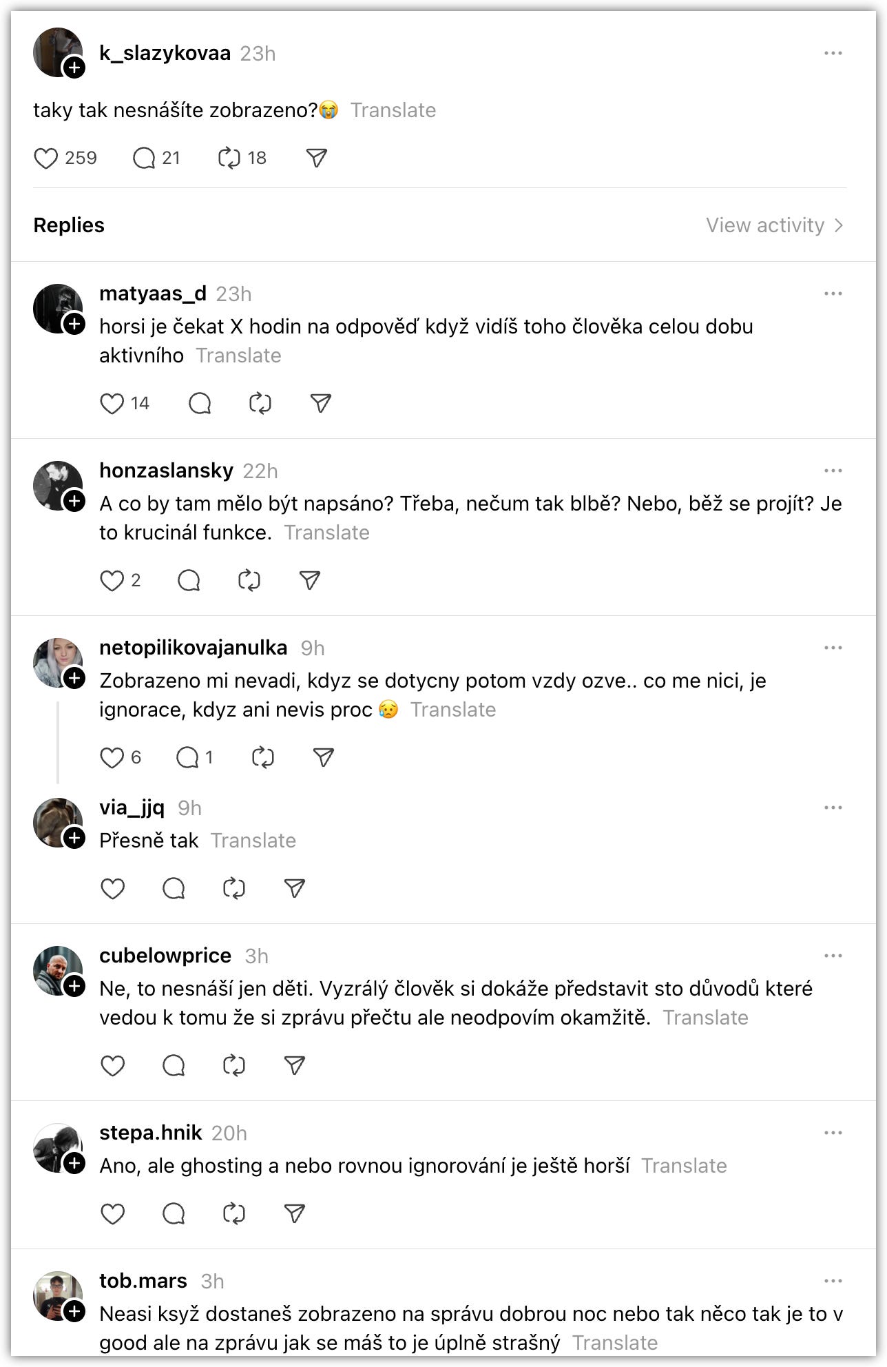 A to jste věděli, že “zobrazeno” není “přečteno”? A že takový ten indikátor “ten druhý píše zprávu” je jen cesta jak vás udržet online a ten druhý nic psát nemusí? A že i “přečteno” nemusí znamenat, že ten druhý může hned odpovědět?