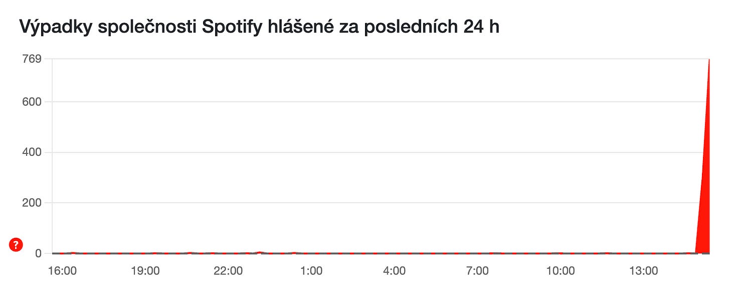 Spotify poněkud stávkuje (15:40, pondělí). A Netatmo ukazuje divné věci mimo vlastní aplikaci. Co ještě asi vypadlo?