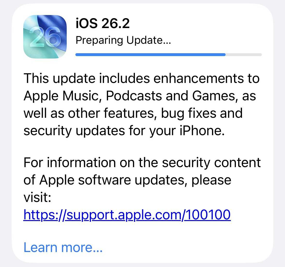 Venku je iOS 26. 2 kde Apple tradičně odmítá přesně sdělovat proč tak náhle, ale vypadá to na opravu zásadních bezpečnostních chyb. A jak už je nově zvykem, už 40 minut koukám na “Preparing Update”.