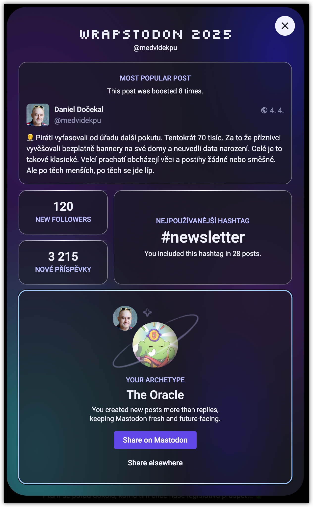 Mastodon Social se snaží o takové ty lákadla pro lidi co jako že právě rok co končí. Jen je to takové rozpačité. Ale třeba to časem bude užitečnější. Mastodon Czech kde je 365tipů to nemá, tak alespoň takto.