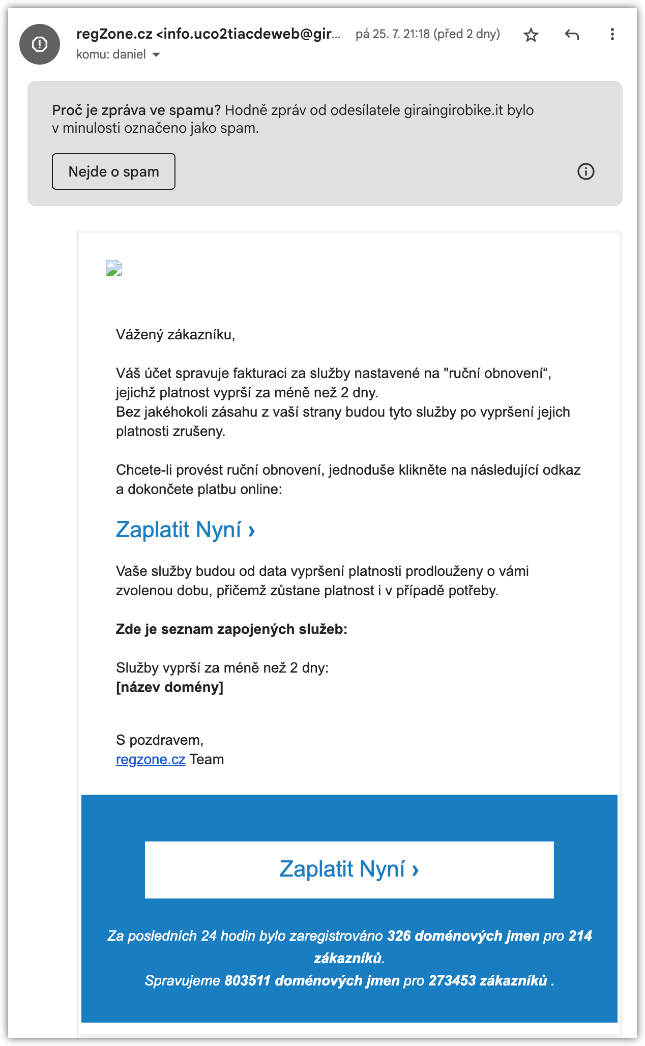 Mohlo by to být náhodné, ale přišlo to na všechny e-maily co mám u domén u regZone, takže to asi bude cílenější. Klasická okrádačka.
